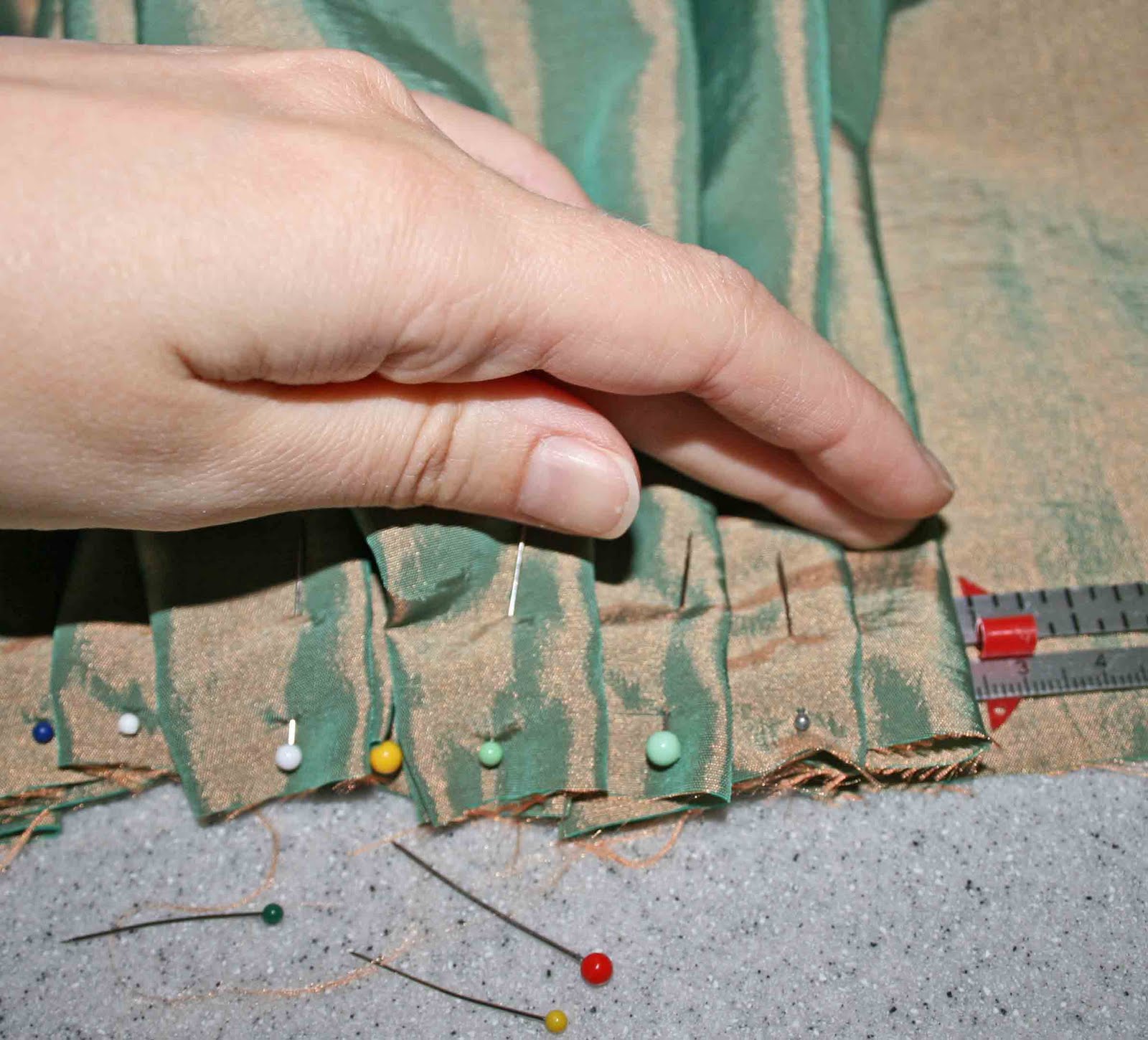 When pleating this direction, it is easiest to set your ruler to the depth you want for the hidden part of the pleat. I set my ruler back to 1".